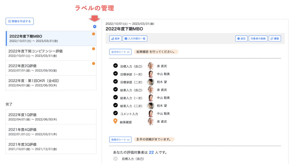 人事評価のトップページの画面の左側でラベルが紐づいていることが確認できます。