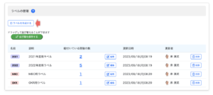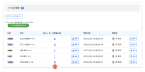⑤ 続いて、作成したラベルに開催を紐付けます。ラベルの一覧画面で、設定したいラベルの「紐づいている開催の数の数字」クリックします。