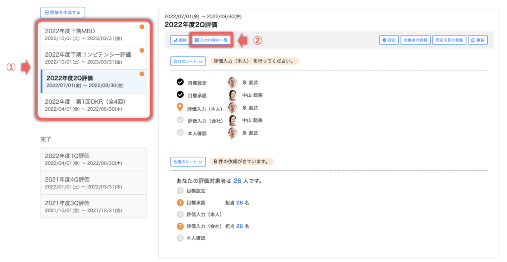 ※自分が開催管理者もしくは運用管理者の開催にのみ、入力内容一覧ボタンが表示されます。