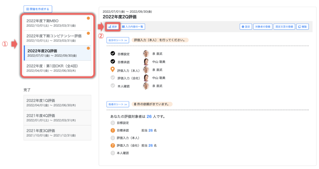 ※自分が開催管理者もしくは運用管理者の開催にのみ、進捗ボタンが表示されます。