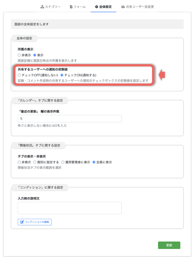 タブ「全体設定」をクリックし、「全体の設定 – 共有するユーザーへの通知の初期値」で設定を変更します。面談記録時やコメント入力時に、共有するユーザーへの通知を選択できますが、その初期値を変更することができます。