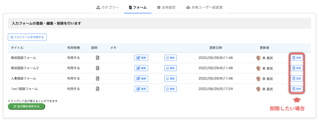 ※削除したい場合は、登録した面談を削除後、入力フォームの削除を行ってください。