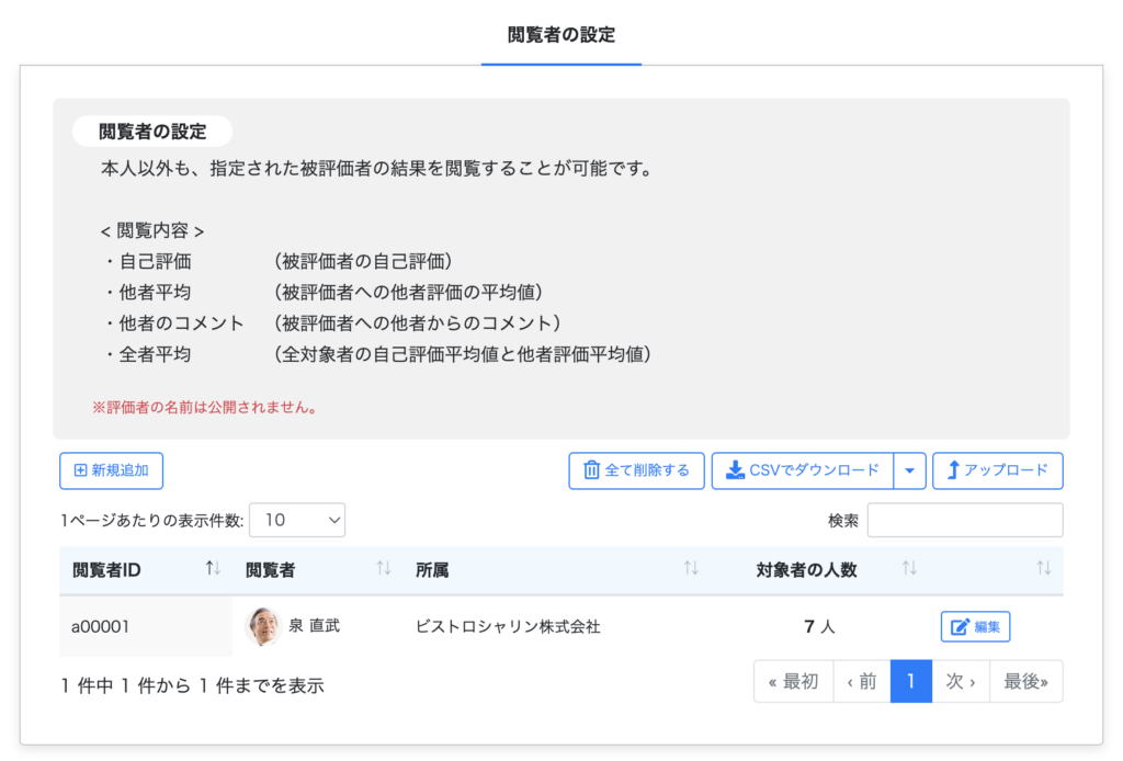 「閲覧者の設定」画面が表示されます。こちらの画面で、閲覧者と閲覧対象者を登録することで、閲覧者は指定された被評価者の結果を閲覧することが可能になります。