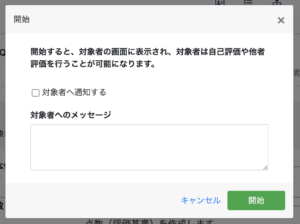 「開始する」をクリックすると、対象者の画面に表示され、対象者は自己評価や他者評価を行うことが可能になります。