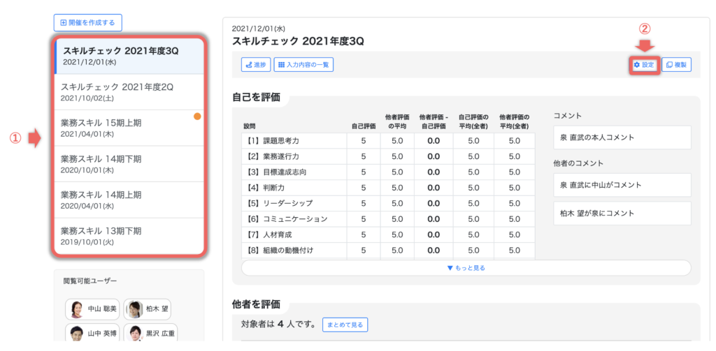 ①基本情報・②点数・③設問・④対象者(自己評価者)・⑤対象者(他者評価者)の設定を完了し、スキル入力を開始します。
