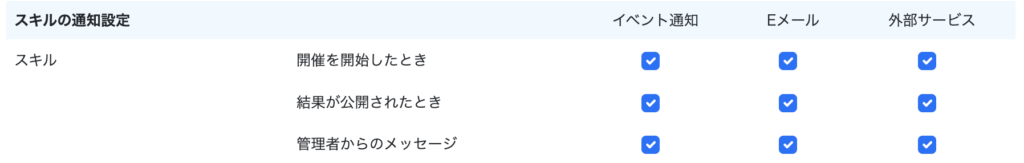 「開始時」や「結果公開時」、管理者からのメッセージなど、それぞれをもらった時の通知の可否を設定できます。また、外部サービスとの連携設定を行います。