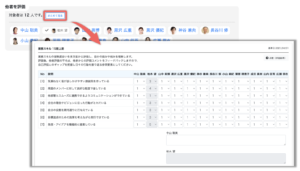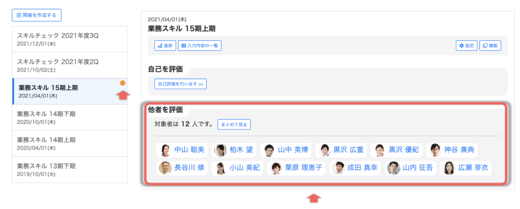 画面左側で該当の開催をクリックし、画面右側に表示される「他者を評価」で評価を行うメンバーをクリックします。