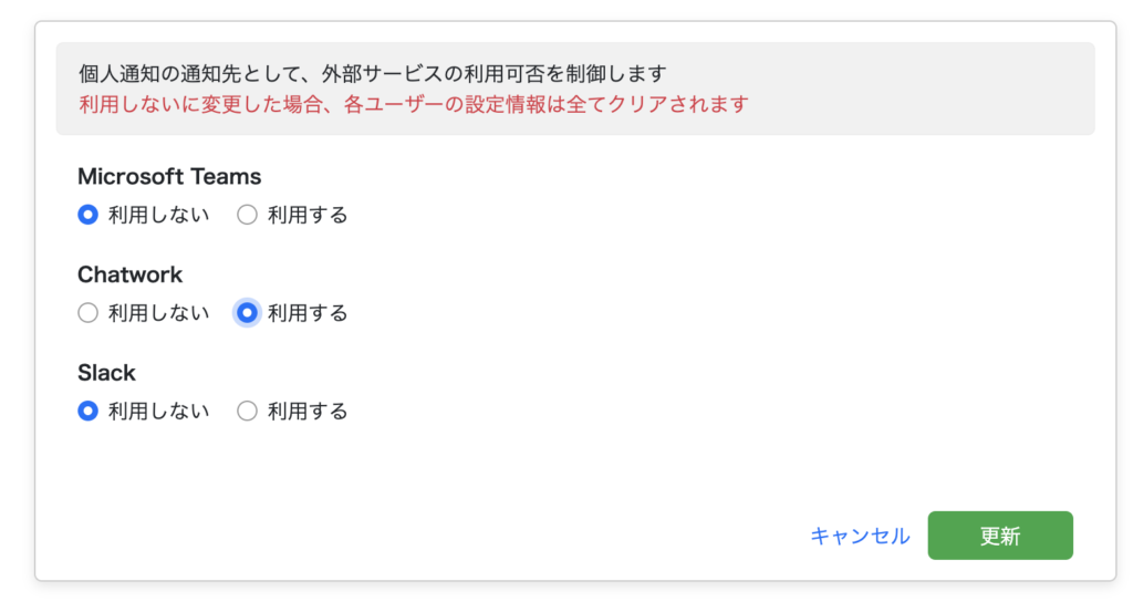 Microsoft Teams、Chatwork、Slackの連携利用の可否を設定します。