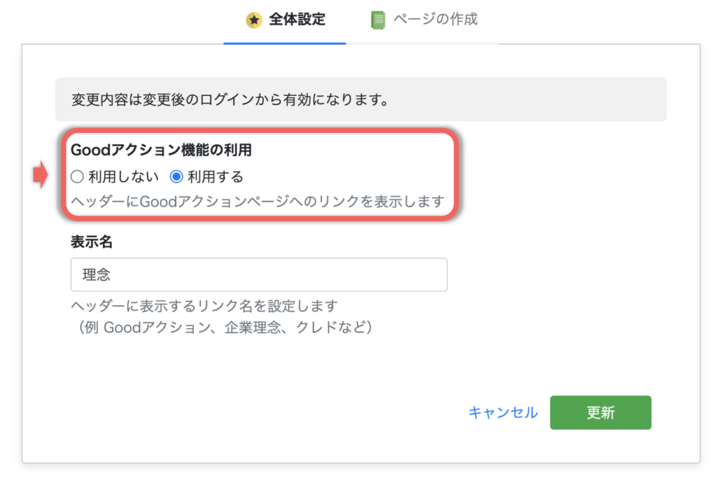 ③ Goodアクションの全体設定画面が表示されますので、「利用しない」から「利用する」に変更し、更新をクリック