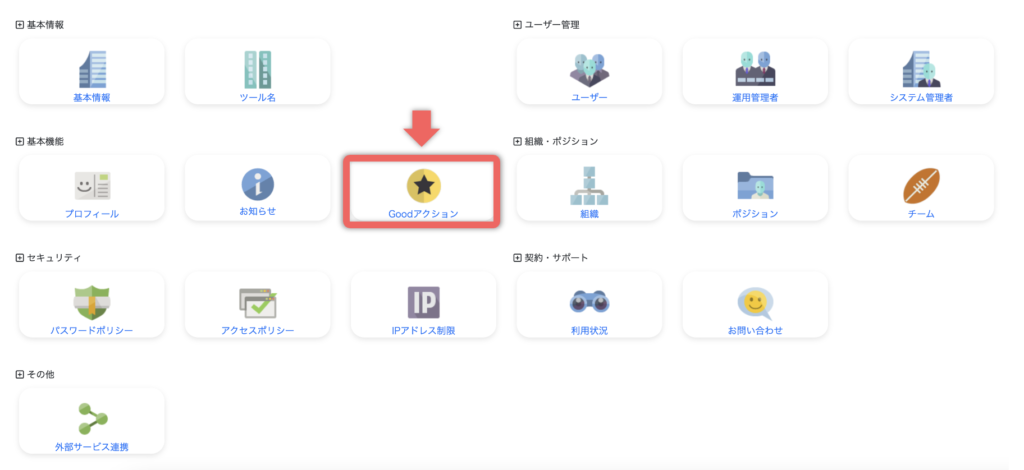システム管理画面の基本機能の「Goodアクション」をクリックします。