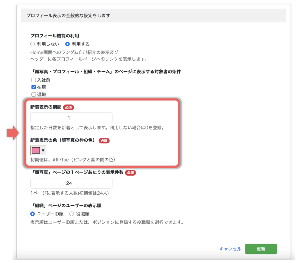 プロフィールを更新したユーザーの顔写真の枠に、一定期間、色をつけることができます。また、期間と色は任意の値に変更することが可能です。
