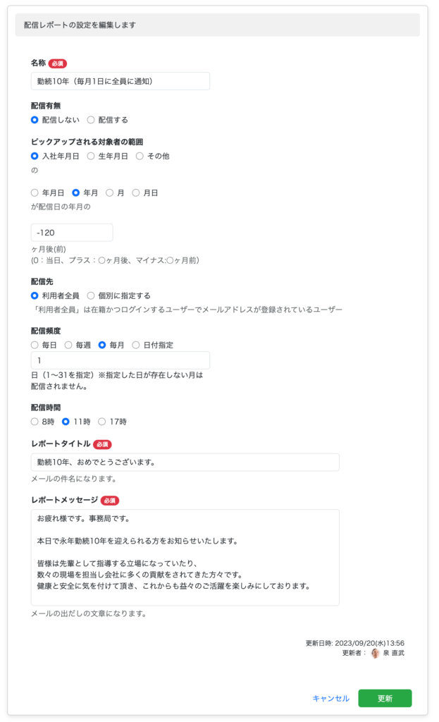まず、入社年月日・生年月日・その他(日付項目から選択できます)から、配信に使用する項目を選択します。次に、選択した日付項目とレポートの配信日のどこを比較するか「年月日・年月・月・月日」から選択し、次にその範囲を指定します(マイナス入力で過去指定)。