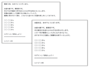 入社年月日や生年月日などの日付項目を使用し、勤続10年の人や、今日が誕生日の人などをお知らせすることができます。