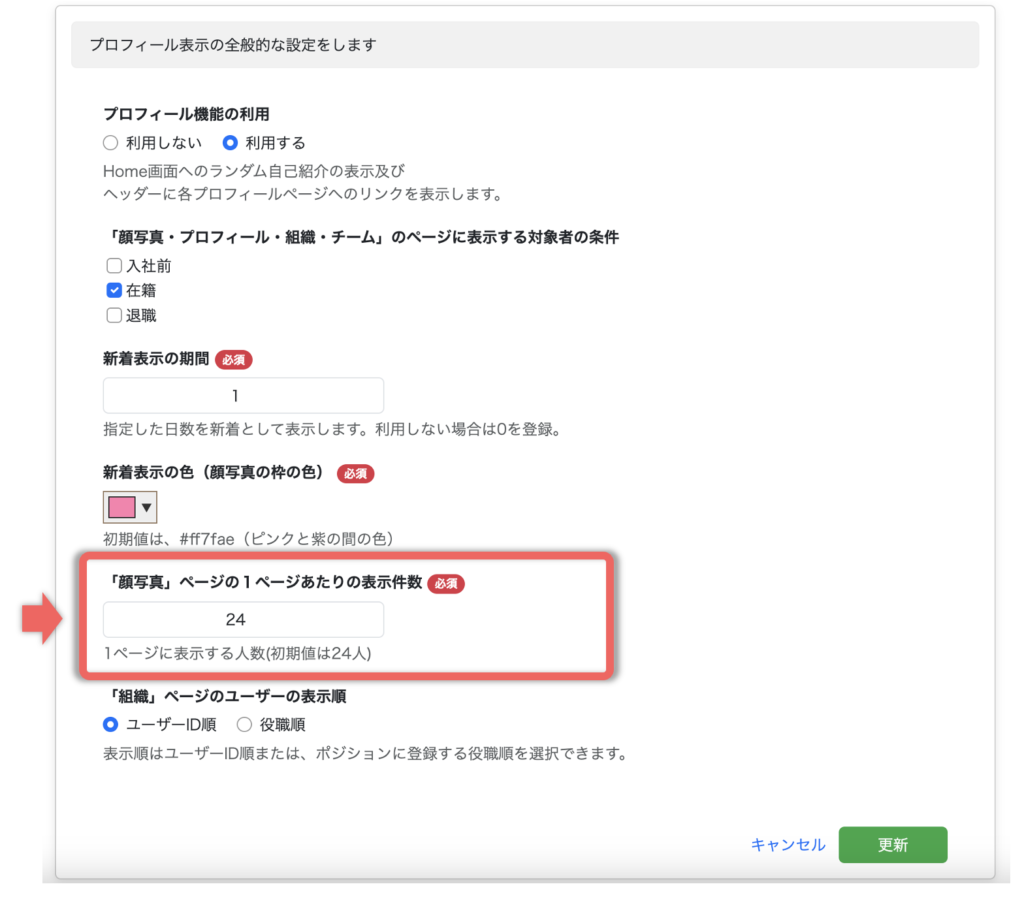 プロフィールの全体設定画面が表示されますので、「表示件数」を変更し、更新をクリックします。