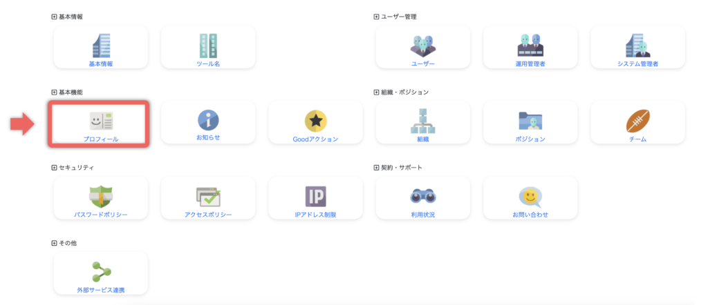 システム管理画面の基本機能の「プロフィール」をクリックします。