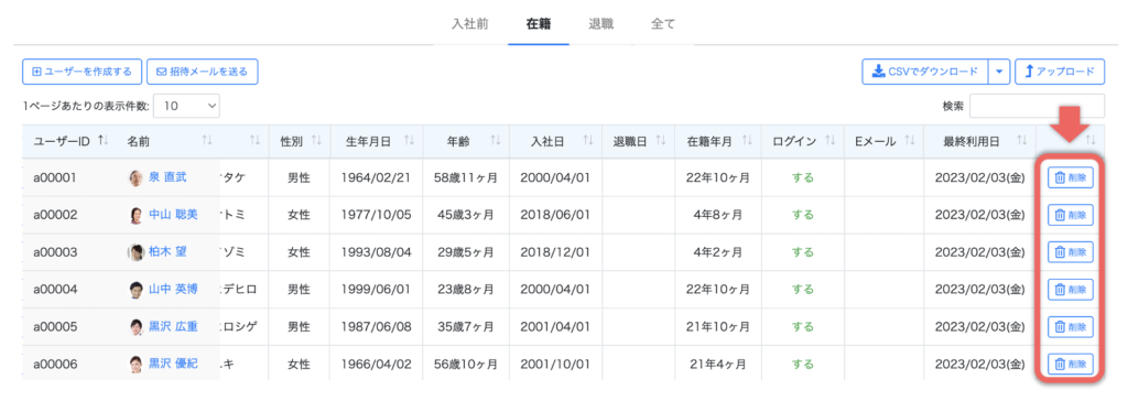 ③ ユーザー一覧画面で削除したいユーザーの「削除」をクリック