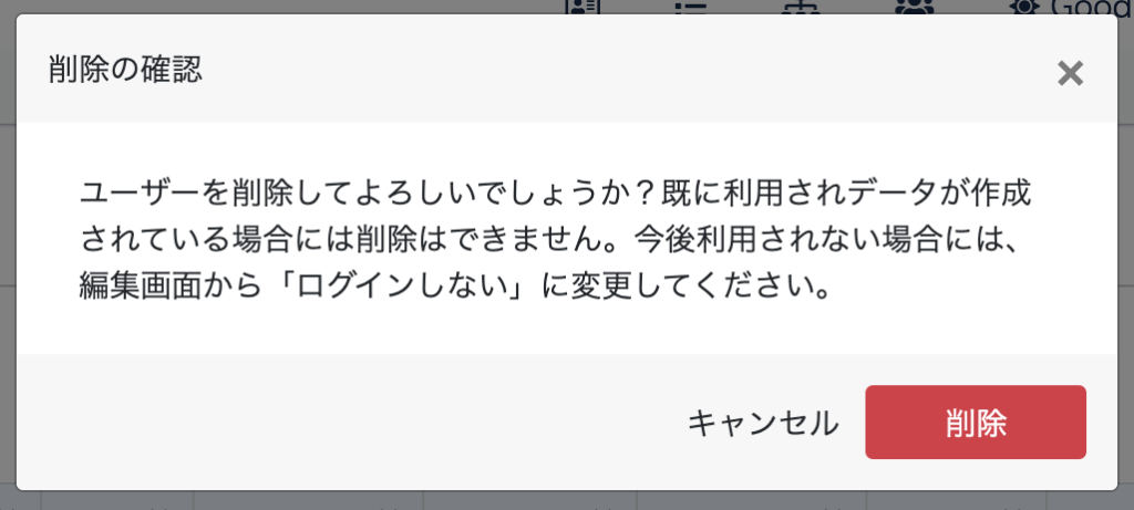 既に利用されデータが存在する場合は削除できません。削除できない場合はメッセージの内容に従い、該当のユーザーが今後サービスが利用できないよう、ユーザーの編集画面から「ログインしない」に変更してください。