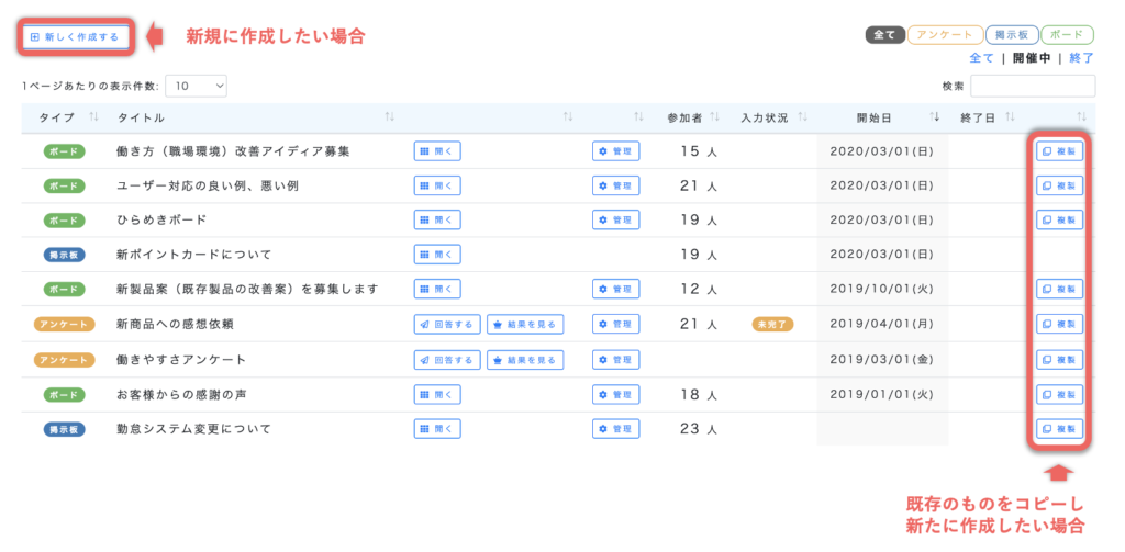 一覧画面が表示されますので、画面左上の「新しく作成する」もしくは「既存の掲示板を複製」し、掲示板を作成します。
